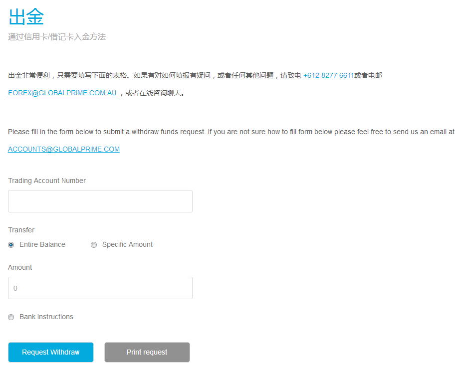 Global Prime平台的出金流程和入金一样,在他们的官网中有详细介绍。按照步骤一一完成即可。如图:
