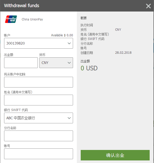 3、点击银联后,出现下图:选择交易账户,填写出金额,中文姓名选择银行填写开户分行的名称以及银行账户,最后确认出金即可