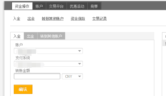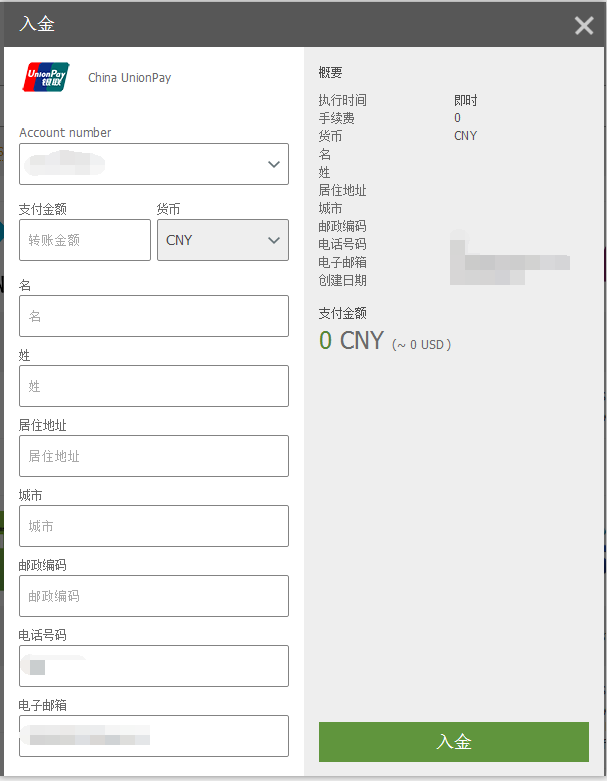 3、点击银联入金,弹出窗口填写资料。如图: Account number是选择交易账户 支付金额是选择入金多少元人名币 名和姓必须拼音 城市和居住地址也必须拼音,城市填写省市,居住地址接着省市的后面写,身份证上一样的 填写邮编,号码,邮箱选择入金。