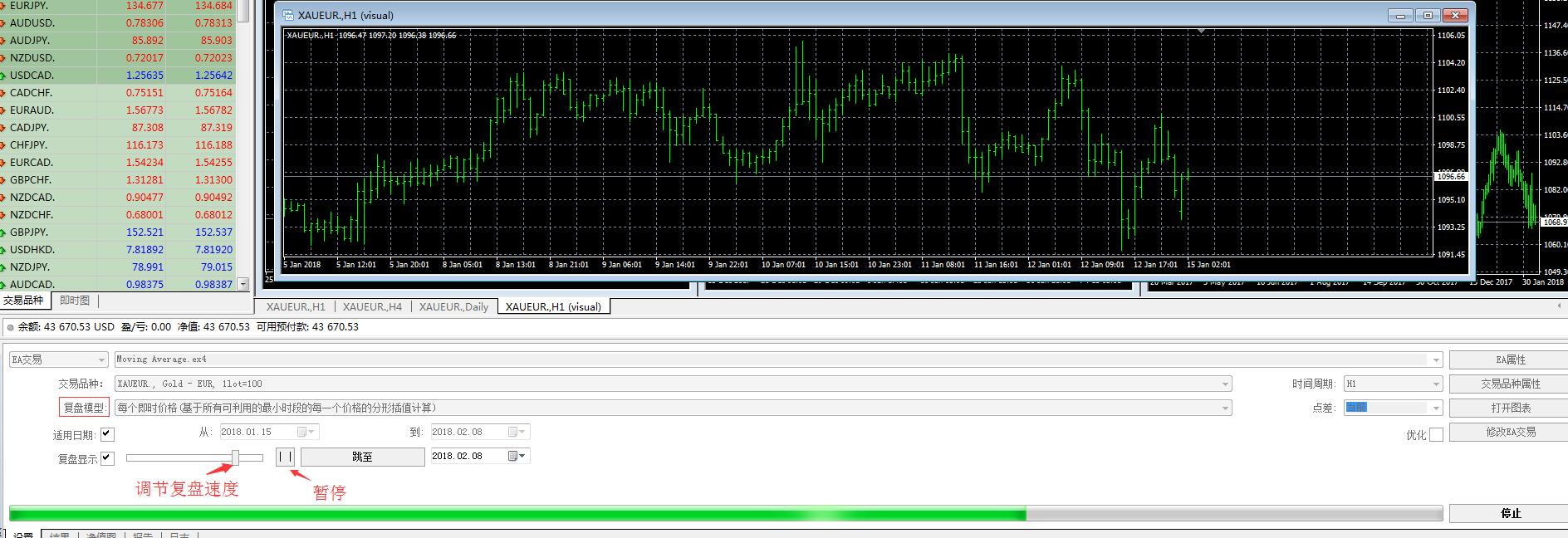 3、弹出的visual窗口就是正在进行复盘数据的窗口。若觉得价格跳动得太慢了,可以再重新调整下复盘模型或复盘速度,想中途终止复盘也是可以的(如图标示)。 <图片单击放大>