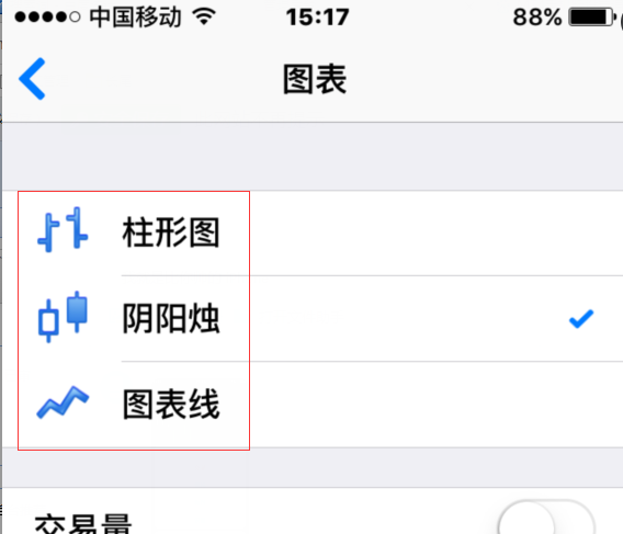 然后进入图表页面后,便可以自由更换图表形状了柱形图、阴阳烛、图表现。如图: