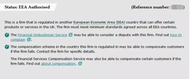 如下图:EEA Authorised说明是欧盟授权,只是允许在英国开展业务。 真正的监管机构并不是FCA,而是这家公司所在欧盟国家的监管机构