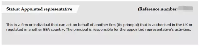 如下图:Appointed representative是 AR牌照,AR授权代表可以是个人或企业, 代表获得受FCA监管或欧盟监管公司的授权许可进行投资服务,由授权公司对授权代表的商业行为负责。