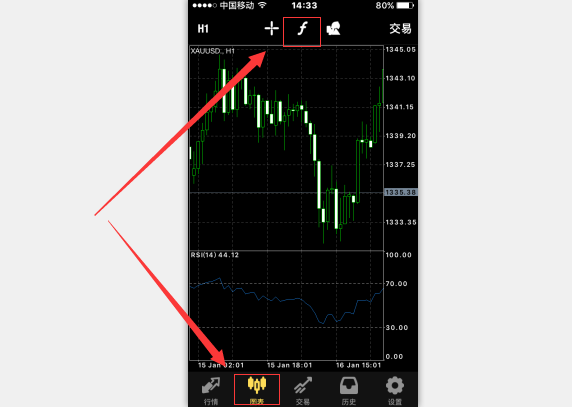 1、打开软件,进入图表界面后,会在图表中找到技术指标的符号按钮