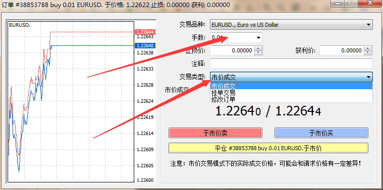接着在弹出的窗口上,把交易类型改成市价成交,再把手数那一栏里选择平0.5手或者0.1手,最后点击平仓就可以啦