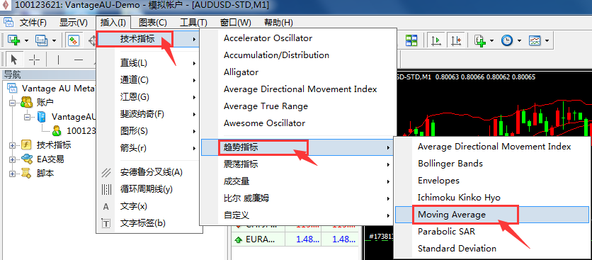 相信广大外汇投资人对于均线都十分的了解了。均线是投资人在进行外汇分析的时候,最常用到的技术指标。那么, MT4上怎么设置均线呢? 均线在MT4上显示为Moving Average指标。投资人在MT4上可以随意设置均线的时间周期,来对市场进行判断。 第一步,交易者需要打开MT4软件。然后在上方菜单栏,选择“插入”选项。 第二步,依次点击“插入”---“技术指标”----“趋势指标”-----“Moving Average”。到这里,均线指标插入就成功了,交易者就可以在MT4上使用均线指标了。 以上的所有步骤都完成之后,就可以在自己的福汇MT4显示栏里面看到自己设置的均线了。 |