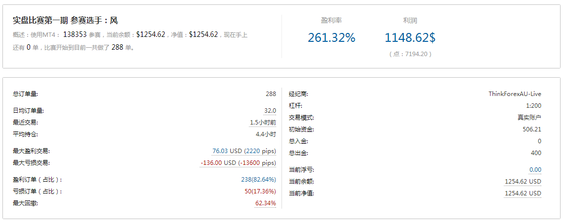 Q 1:什么时候接触到外汇的? 风:三年前第一次接触外汇的,到现在已经有三年了 Q 2:这次实盘比赛跟我们合作的平台是ThinkMarkets智汇,你觉得这个平台在交易环境,点差,交易成本等个方面怎么样啊? 风:还算比较好的,不过一个月下来,因为做的单子也比较多,所以总的交易成本还是比较高的 Q 3:这期的实盘比赛,你主要是做什么品种? 风:股指为主,黄金、美加也占了一部分,但是大部分利润还是来源于股指的 Q 4:这个问题应该是很多人比较关注的;是什么样的交易策略让你在本次实盘比赛中胜出的,可以给大家分享下吗? 风:我以短线为主,有一定的利润就平仓,亏损达到100$以上,也果断平仓,以游击战为主,总之先落袋为安 Q 5:在本次比赛中你有遇到什么问题吗,是怎么逐步解决的(比如连续亏损了怎么解决心态上的问题;是否是交易策略的错误导致亏损的,如果调整策略)? 风:是的,出现过几次因为重仓导致资金较大回撤,也是贪婪和不服输的心理在作怪,发觉后,等到合适的位置,果断全部平仓,即使后期可能有大利润,但是重仓任何时候都是非常危险的,而在这个市场中,生存永远放在第一位,因此,时刻避免重大风险,重仓属于其中之一。而出现这种情况后,我会平仓后,停止交易一段时间,比如比赛后期有近一个星期没有交易 Q 6:最后,你有什么经验可以给新手外汇交易者吗? 风:刚开始切记不可入金太多,因为前期基本都是交学费,入金越多,交的学费越多。后期有了一定的盈利能力后,可以逐步增加操作资金规模,不可重仓,轻仓交易积累经验,并且最好带上止损 Q 7:您已经是我们的客户了,是什么原因让您选择了【开汇返佣】的服务呢? 风:为了降低交易成本,我在网上搜索相关信息,因此很快地就找到了【酷汇返佣网】