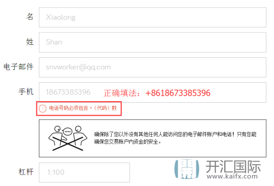 【酷汇返佣网】解答:在Exness开设账户(点击开户)的时候,可能会碰到提示“电话号码必须包含 +(代码)数”的情况。这是因为填写电话号码的时候,没有加上国际区号所致,中国的国际区号为“+86”,只要在电话号码前面加上国际区号即可。