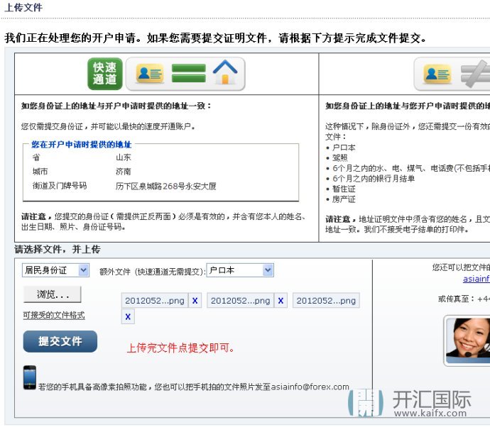 有时候会碰到身份证明提交不上的问题,这有可能是网络的问题,也有可能是浏览器的问题。如果碰到这种情况,您可以直接用您的开户邮箱发送邮件到嘉盛官方邮箱asiainfo@forex.com,把身份证明文件添加到邮件附件里面,邮件主题可以写“身份证明文件提交”,嘉盛那边收到邮件之后为您审核通过之后,很快您就会收到账户开通的邮件。 如果您还有其他疑问,请联系酷汇返佣网在线客服。 |