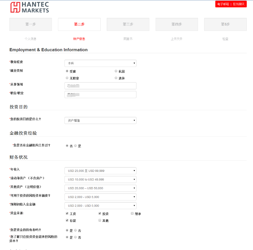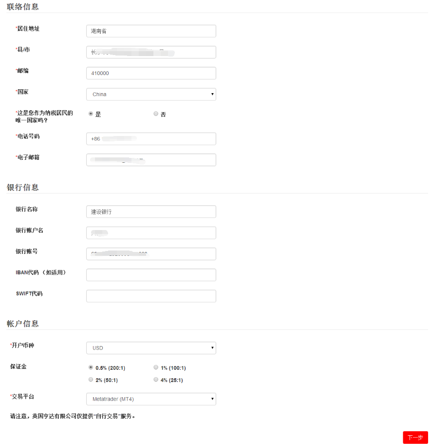 4.填写联络信息和财务信息,请注意:开户表格上的地址需要和地址证明上的地址一样。