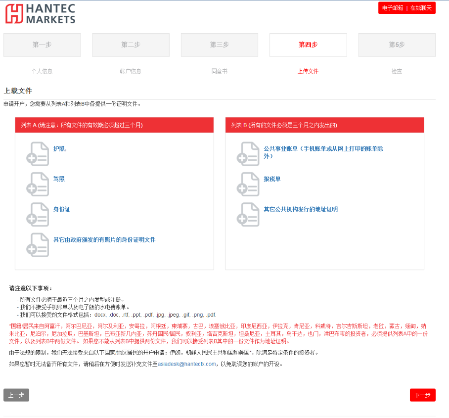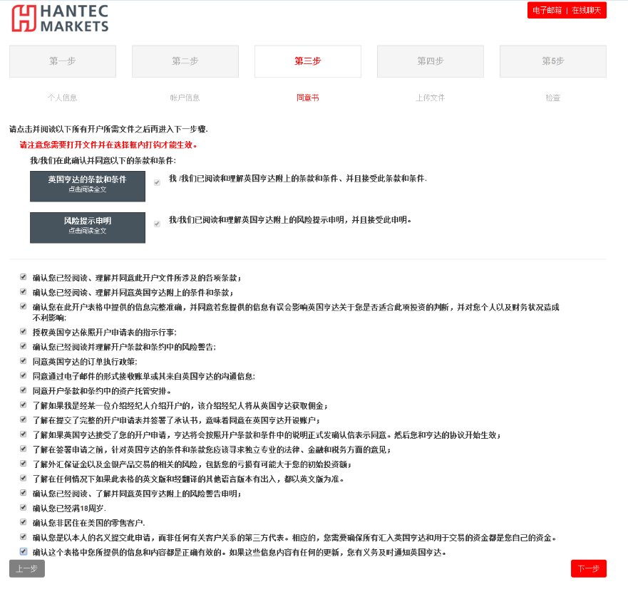 身份证明文件(含有出生日期,并在有效期内):护照,驾驶执照或身份证等; 地址证明文件(含有详细地址,并且是3个月内):银行的月结单,信用卡账单,网银截图,有效的租赁合同或水电费单等。 开户成功后,客户将收到包含客户办公室管理登录账号和密码、MT4 登录账号、出金验证码的邮件,可根据邮件链接下载 MT4交易平台。 8.进入下一步,检查完并提交。英国亨达Hantec开户流程就到这里结束了,如您还有不明之处,请点击这里联系酷汇返佣网在线客服在线客服。 |