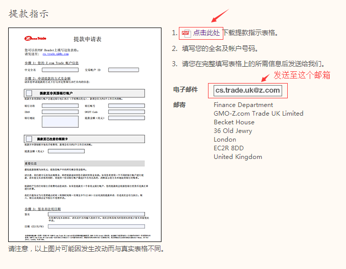 3.下载提款申请表并将它填写好,发送至官网邮箱(也可以选择邮寄,以下图有地址)