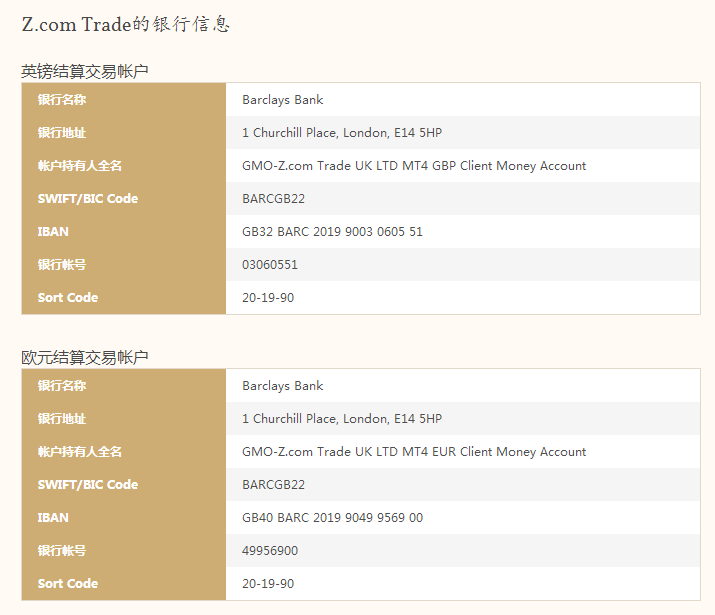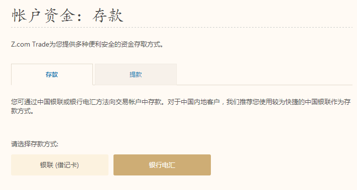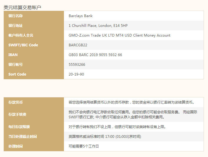 通过银行电汇存款 ①.在您给我们的银行账户电汇款项时,请在转帐备注中填写您的真实帐户用户ID。我们的银行信息如下,请依照您的帐户结算货币存款至适当的银行帐户。您的存款银行帐户的持有人必须与您注册的真实交易帐户的持有人姓名一致。 ②.在您的款项和存款备注明细被核实后,您的资金将被添加到您的交易帐户中。如果您不能添加汇款备注,请您将您的电汇存款的明细通过电子邮件发送到 cs.trade.uk@z.com通知我们。 ③.如果我们已经收到了您的存款但是因您未提供我们要求的信息而未能核实这笔款项,我们将会把您的存款搁置10个工作日直到必要信息被上传为止。如果您未在10个工作日内提供这些信息,款项将会被退还到资金来源的帐户。 3.选择您想汇款的银行