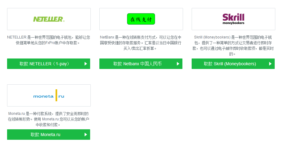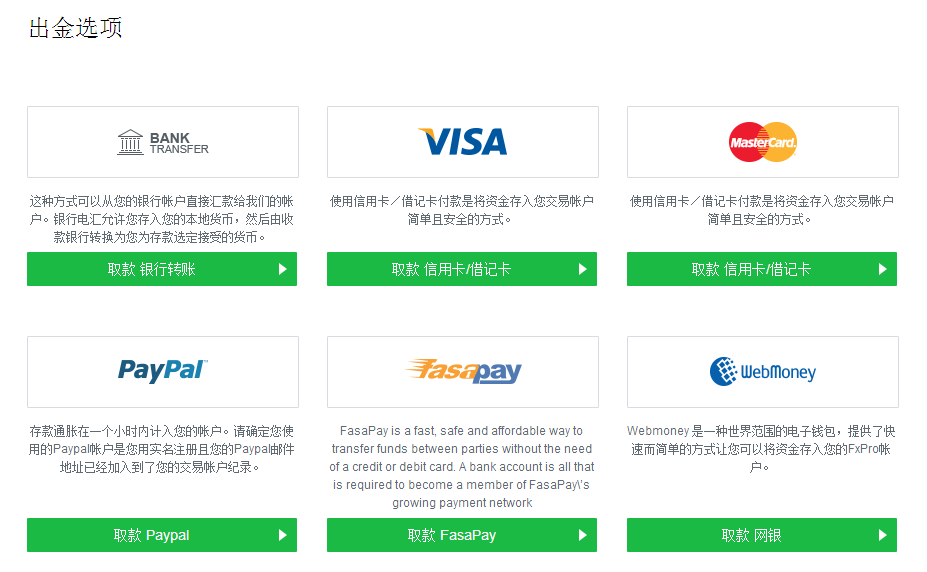 4.出金的方式有以下14种: 1.电汇 2.信用/借记卡 (包括Visa, Visa, Visa Electron, Visa Delta, MasterCard, Maestro 国际卡, Maestro 英国卡,请注意, 大陆客户目前只支持工商银行的国际牡丹卡) 3.PayPal贝宝 4.Skrill 5.Neteller 6.China Union Pay中国银联 7.mPay 8.FasaPay (印度尼西亚客户可使用) 9.Webmoney (俄罗斯客户可使用) 10.Moneta 11.Boleto (巴西客户可使用) 12.Netbanx 银联(中国客户可使用) 13.eProtections (日本客户可使用) 14.FxPro 英国有限公司客户可以用电汇或者信用卡/借记卡出入金
