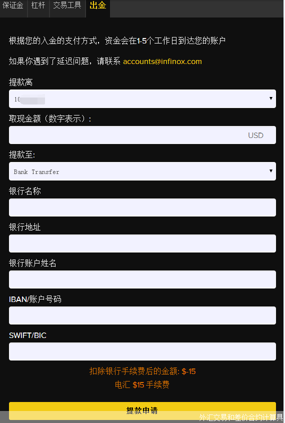 2.登陆之后会出现这个界面,点击出金,填写个人的银行卡信息和出金的金额(注:银行卡账户姓名和号码必须和在银行卡留的姓名号码保持一致,出金的话将收取$-15手续费)