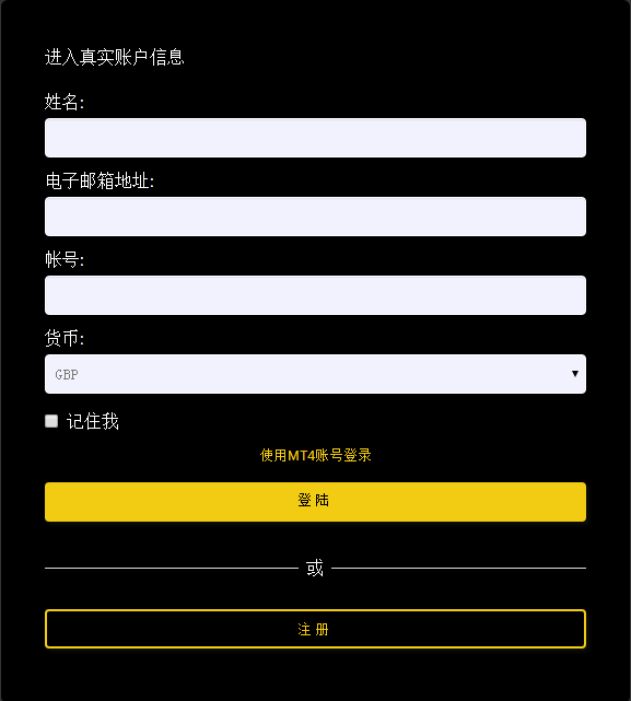 1.输入个人MT4账号、密码(注:名字填写拼音,姓氏填写在后)
