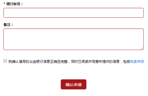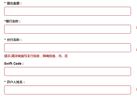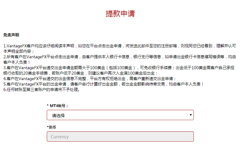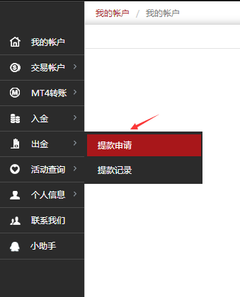 提款申请:客户在这里提交出金申请,出金申请需要填写 MT4 账号,货币,出金金额,银行名称,分行名称,Swift code(电汇出金需要填写,银联出金填无即可),银行户名,提款理由,然后点击确认申请