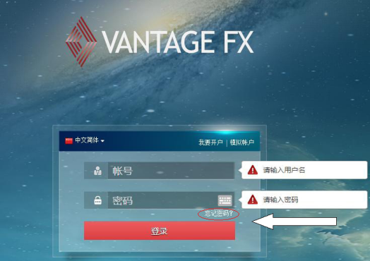 首先:需要登录Vantage FX MYACCOUNT的网址,输入注册时使用的邮箱和密码(此处密码是注册时设置,如忘记,请点击忘记密码找回) https://myaccount.vantagefx.cn/
