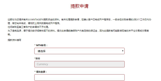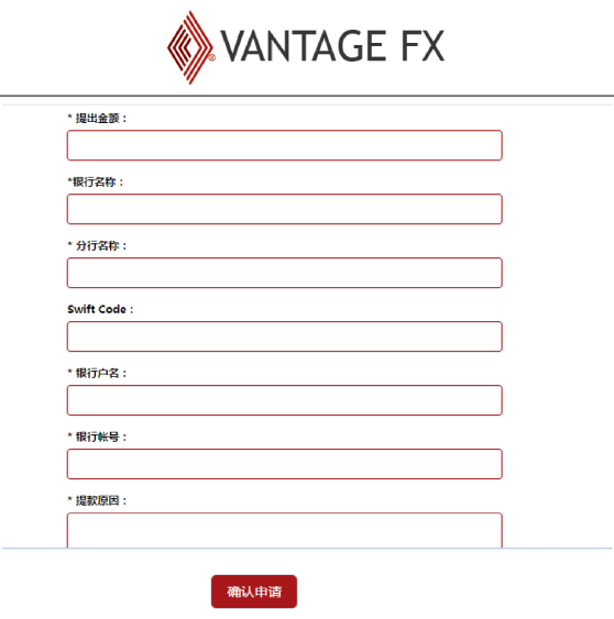 提款申请:客户在这里提交出金申请,出金申请需要填写 MT4 账号,货币,出金金额,银行名称,分行名称,Swift code(电汇出金需要填写,银联出金填无即可),银行户名,提款理由,然后点击确认申请。
