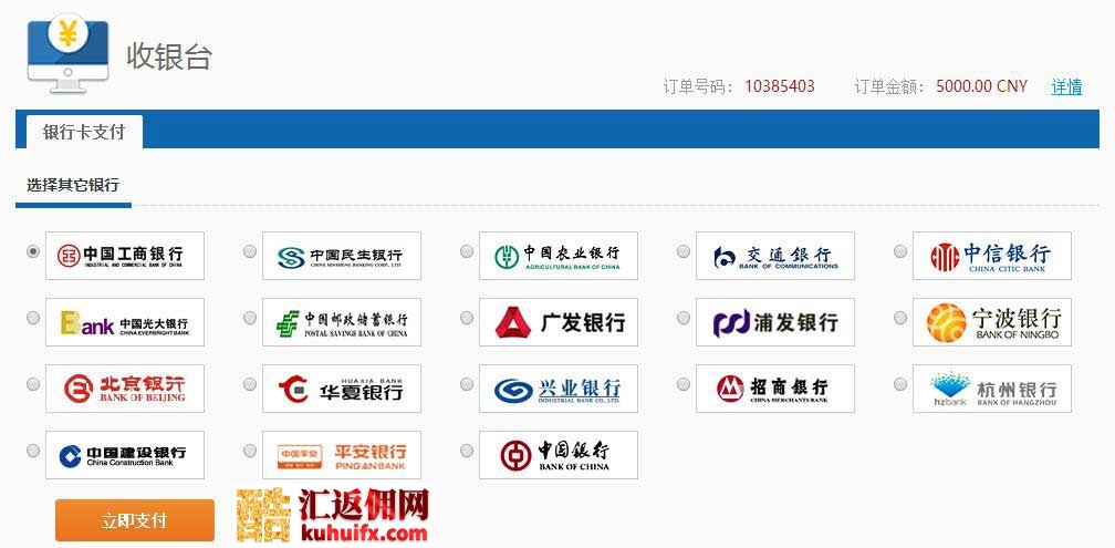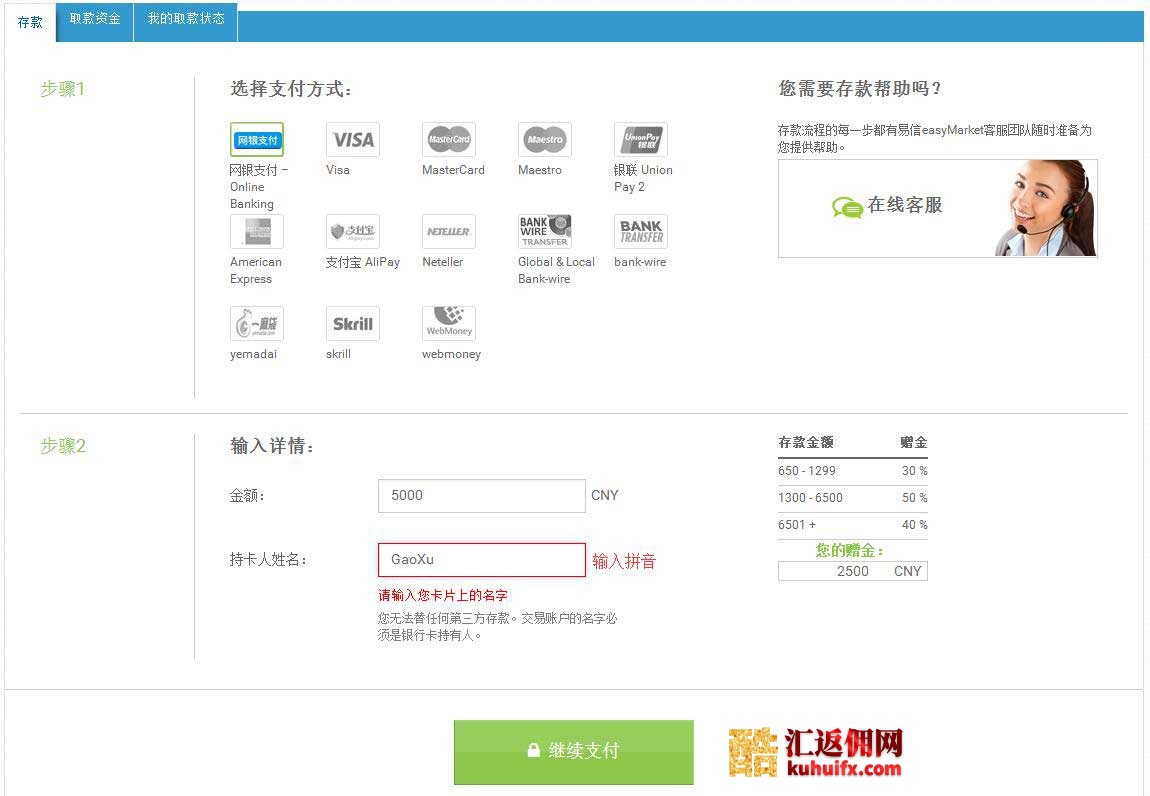 三、选择网银支付并填写入金金额,之后点击继续支付。