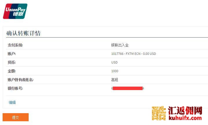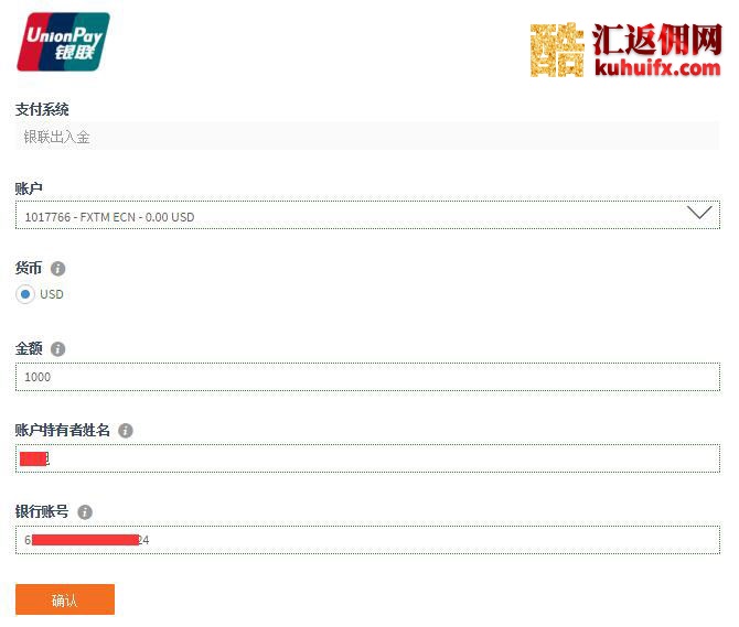 至此,富拓FXTM银联入金流程已全部结束,如您有其他疑问,可以咨询酷汇返佣网在线客服 在线客服。 请注意: 1. 第三方支付将不被接受。 2. 富拓(FXTM)要求您提交以下资料以处理您的存款: 每一项以新的银行账户所做的初始入金必须提供该账户的银行对账单,该对账单需要印有您的名字,账户号码和已做的交易。所有资料必须清楚可见。 富拓(FXTM)将会在收到以上资料后尽快处理您的存款。虽然往后存款时您不需要再提供以上资料,但是富拓(FXTM)有权利向您索取银行账户的额外证明。 3. 最低入金是 10 人民币, 您的银联网上支付额度会受具体银行卡发卡行的规定限制,详情请联系您的银行。 4. 富拓(FXTM)只接受以人民币为单位的银联(CUP)交易。所有通过银联交易存入的人民币将自动转换成美元; 请在您的 MyFXTM 汇率列表中查看兑换率。 5. 由FXTM客户生成的交易,交易处理器将以每笔交易向接收方征收费用(查看汇率表)。通过处理器接收到的净金额将会张贴到您的交易账户。 6. 如果存款是成功的,资金将在不久后被张贴到您的交易账户。若富拓(FXTM)无法核实您的资料,那将会有所延误。 7. 所有银联取款必须发送回我们接受存款的同一个账户里。 8. 我们只会通过富拓(FXTM)官方电邮地址与您联系以索取您的银联账户资料。我们从来不要求提供隐秘性资料 (安全密码, 银行余额等)。若您从不明电邮收到任何可疑的要求,请联系: backoffice@fxtm.com |