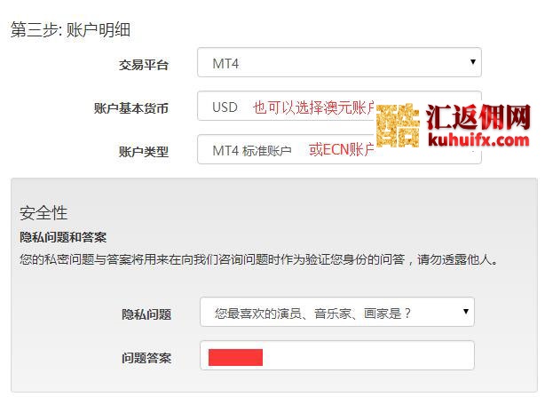 4、填写账户明细。选择交易平台为MT4,账户基本货币为美元(USD)或澳元(AUD),账户类型为标准账户或ECN账户。 此外,隐私问题请务必自己记住,不要遗忘丢失。
