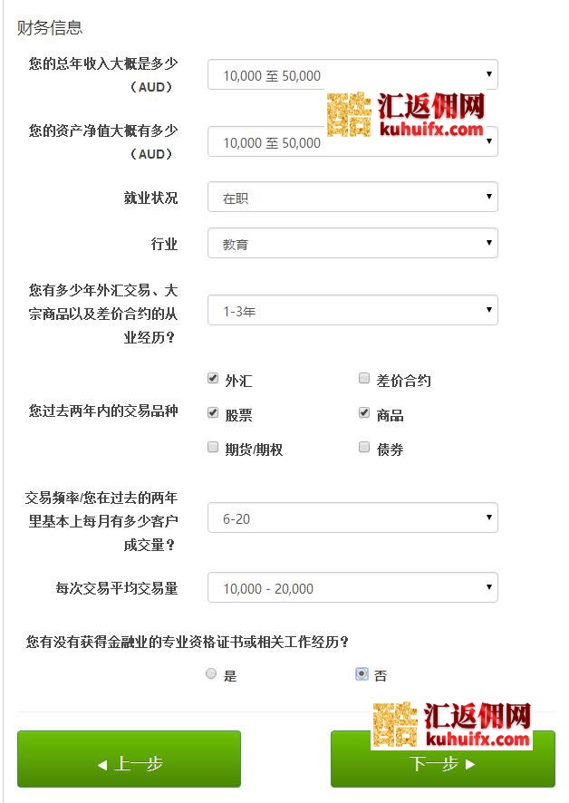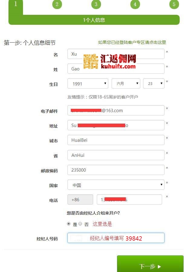 2、填写个人信息,注意姓名及地址等都要用中文拼音填写。经纪人号码填写39842,即酷汇返佣网的编码。