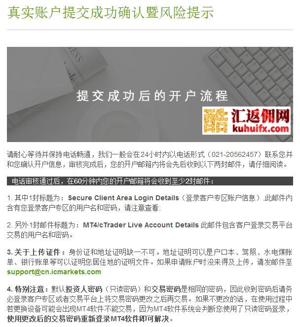 注意事项: 请耐心等待并保持电话畅通,我们一般会在24小时内以电话形式(021-20562457)联系您并和您确认开户信息,审核完成后,您的开户邮箱内将会先后收到以下两封邮件,请仔细阅读。 电话审核通过后,在60分钟内您的开户邮箱将会收到至少2封邮件: 1. 其中1封标题为:Secure Client Area Login Details(登录客户专区账户信息),此邮件内含有您登录客户专区的用户名和密码,请注意查看; 2. 另外1封邮件标题为:MT4/cTrader Live Account Details 此邮件包含客户登录交易平台交易的用户名和密码。 3. 关于上传证件:身份证和地址证明缺一不可。地址证明可以是户口本、驾照、水电煤账单、银行账单等可以证明您居住地的证明文件。如果申请账户时没来得及上传,请发邮件至support@cn.icmarkets.com 4. 特别注意:默认投资人密码(只读密码)和交易密码是相同的密码,因此收到密码后请务必登录客户专区或者交易平台上将交易密码更改之后再交易。如果不更改的话,在使用过程中若更换设备可能会出现MT4软件不能交易,因为MT4软件系统会判断您使用了只读密码登录,使用更改后的交易密码重新登录MT4软件即可解决。 |