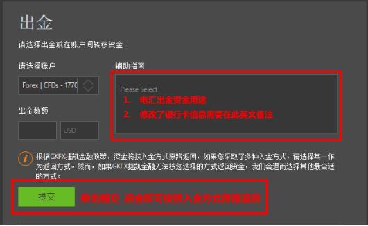 3、填好要出金的金额,并填写辅助指南,说明出金用途等信息。点击提交,资金即按照入金方式原路返回。