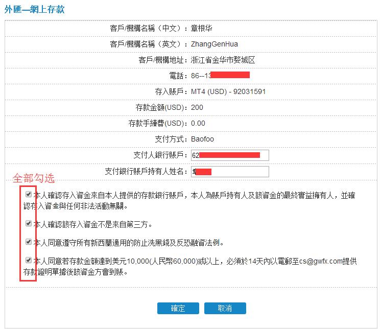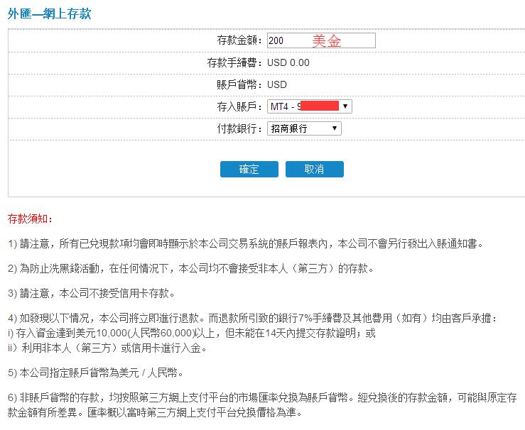 三、网上存款。输入存款金额(美金),并选择要存入的MT4账户,及付款银行。点击确定: