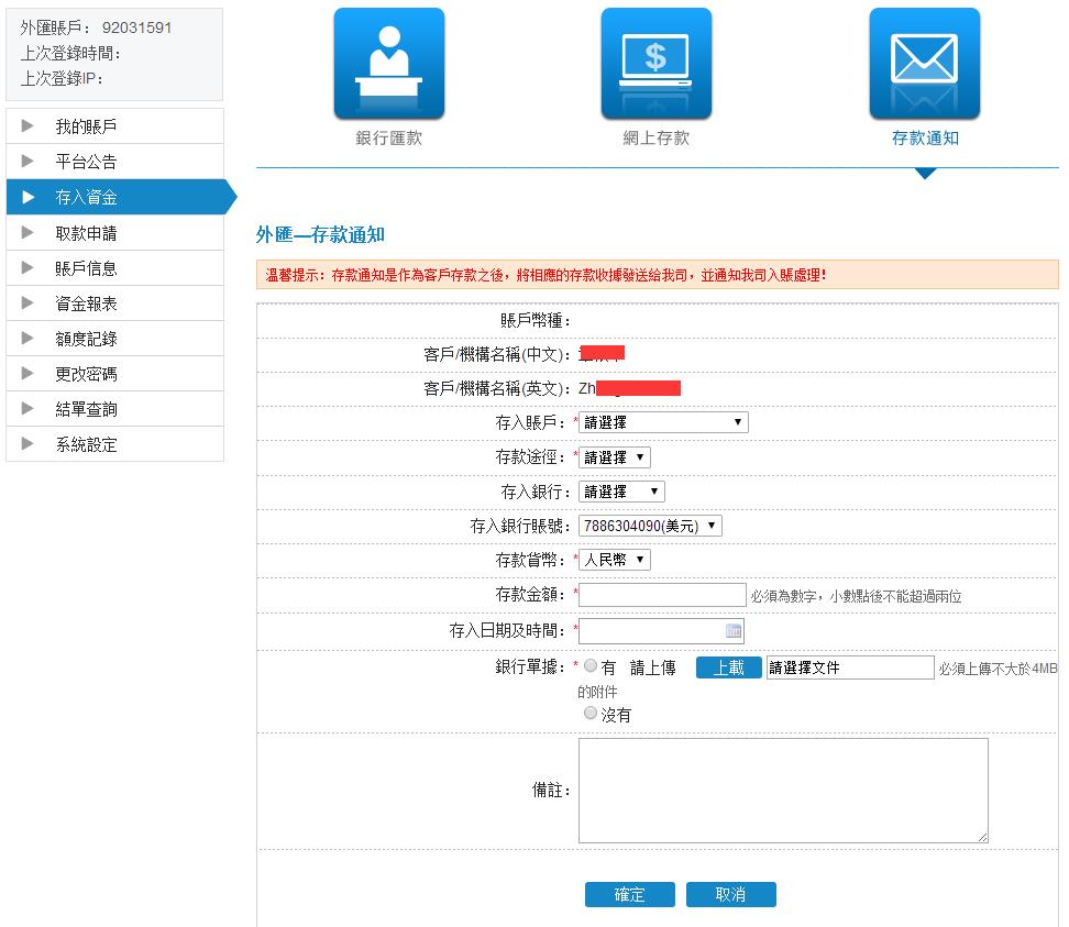 六、将存款收据发送给金道环球投资,以通知其入账处理。点击存入资金-存款通知,然后输入您的存款信息,并上传银行单据。