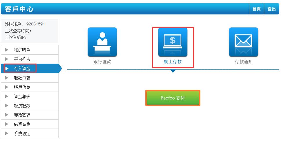 二、点击存入资金,选择网上存款,并点击Baofoo支付(注):