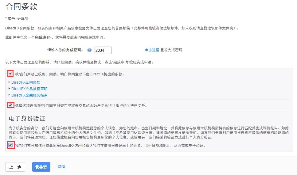 6、在注册邮箱里面,会收到一封邮件,包含一个四位数的完成密码,在文本框输入完成密码。勾选三个复选框,并点击我接受。