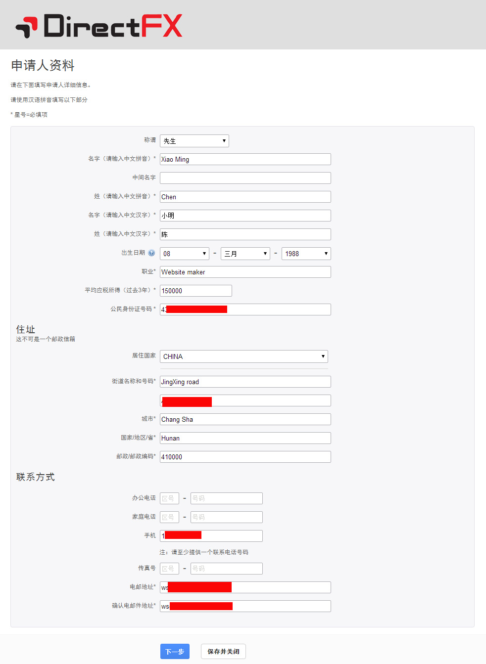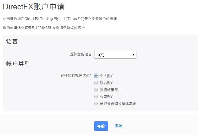 DirectFX开户流程很简单,使用官网开户链接,可以很快完成开户,开户链接>> 按照以下步骤进行开户即可,如有疑问,可以直接咨询本站在线客服: 1、点击开户链接进入DirectFX开户第一步,语言选择中文,账户类型为个人账户,点击下一步。