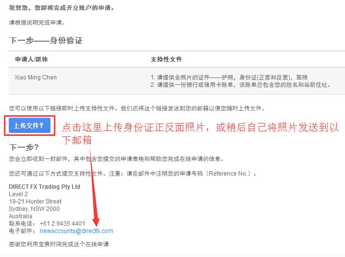 7、提交身份证明文件,可以直接点击“上传文件”按钮,也可以稍后自己将照片发送至以下邮箱: newaccounts@directfx.com