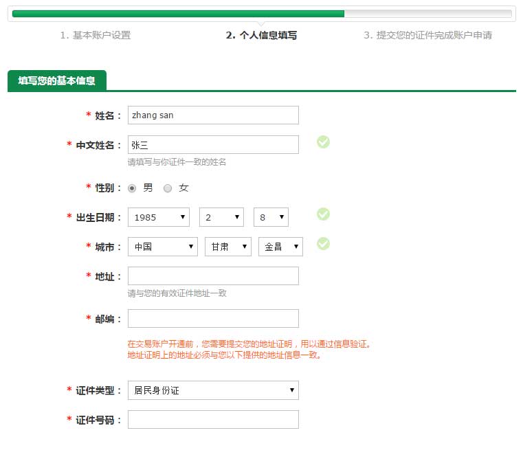 二、进入开户页面,填写完基本信息,然后点击注册。
