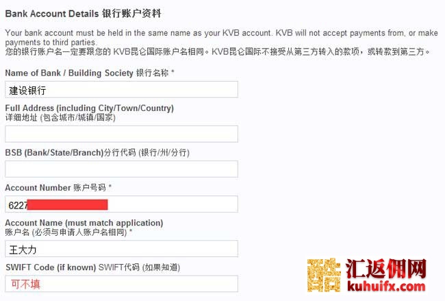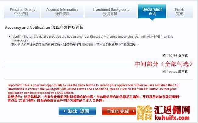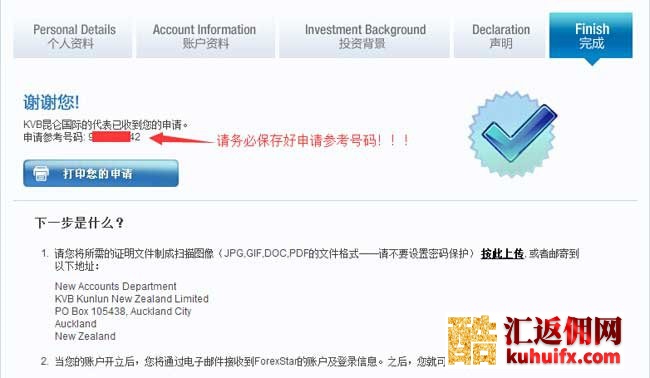 七、将以下资料发给酷汇返佣网客服,一个工作日之后,账户就可以开通了。 ●申请参考号码 ●身份证正反面照片 ●银行卡正反面照片(银行卡反面要签名) 至此KVB昆仑国际开户流程已经全部完成了。 |