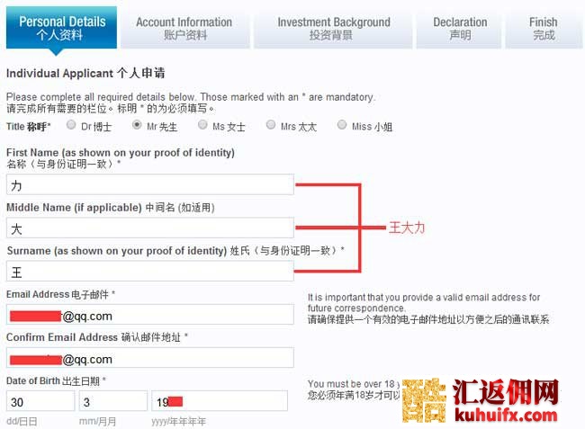 二、填写个人资料。 1、注意填写名称、中间名、姓氏。如“王大力”: