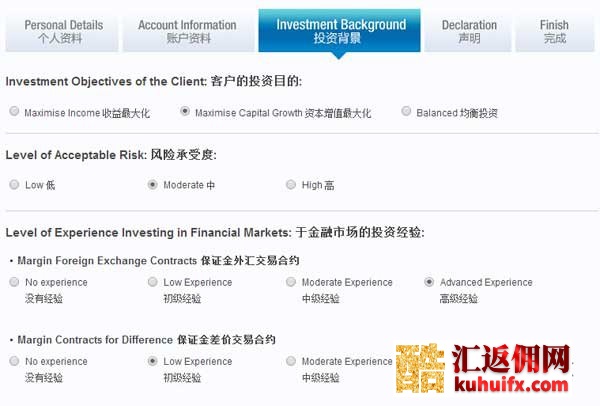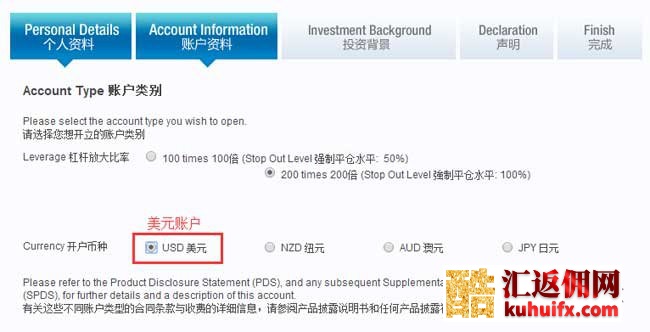 三、填写账户资料。 1、选择美元账户,保证金比例放大比例可根据需要填写(不同比例强制平仓比例也不一样)。