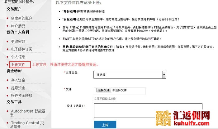 注意:如果您没有提交身份证明及地址证明等文件,您需要提交文件并审核通过之后才能提取资金。 您在迈肯司Markets.com可以提交的文件如下: ● *(必需)身份证明-护照/驾驶执照/身份证 ●*(必需)居住证明-近期公用事业费账单,地方政府近期税单,银行或信用卡声明 (过去6个月之内) ●信用卡/借记卡-如果您想用信用卡/借记卡给帐户注资,请扫描您的银行卡的正面和背面。为了您的安全,请涂黑正面上显示的中间8个号码(必要的话,同样涂黑背面的)以及背面上的CVV(安全代码)。 ●SWIFT-如果您采用电汇的方式为您的账户充值,请上传您银行的SWIFT确认。 ●其他-我公司验证部门要求的其他文件,诸如:授权委托书、地址声明、家庭成员声明、存款声明、第三方汇款协议、第三方信用卡协议和任何其他要求的文件
