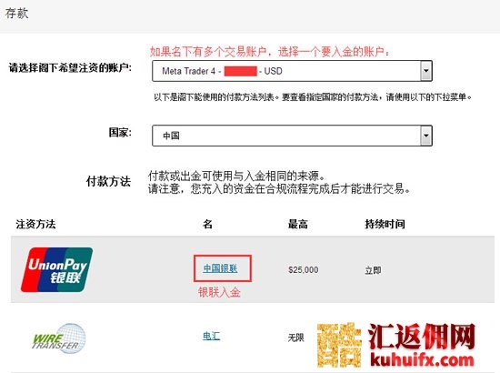 三、选择要入金的账户,注资方式选择[中国银联]。