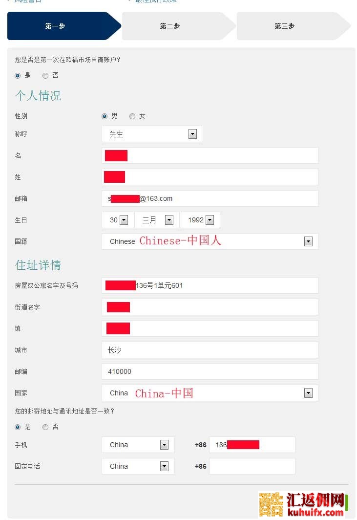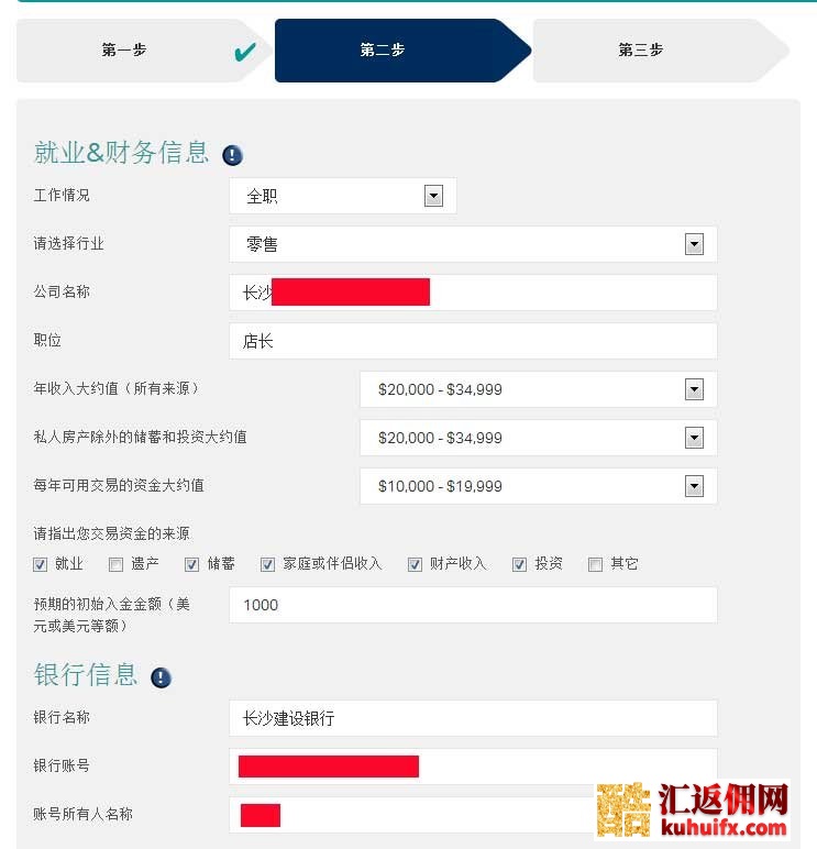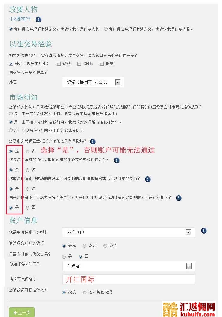 注意:在 [您如何得知我们] 这一栏要选择“代理商”,代理名字填写“酷汇返佣网”。
