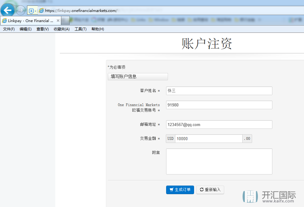 二、提交账户注资“订单”。 在下图中填入客户姓名(可以是中文,或者拼音)、交易账号、注册邮箱、入金金额。