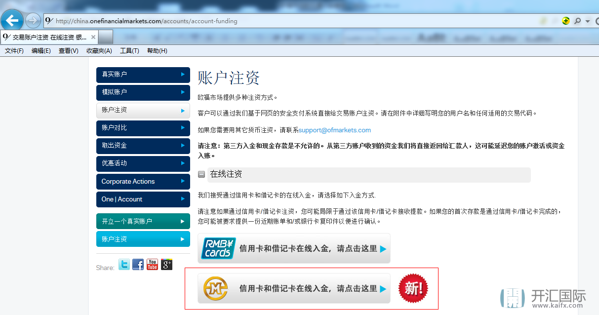 欧福市场OneFinancialMarkets独家推出联网通在线注资(银联人民币入金方式),联网通入金方式更有优惠哦! 欧福市场OneFinancialMarkets入金通道(点击查看其他入金通道): ● 联网通在线注资(推荐) >> ● 银行汇款(电汇) >> 如果您需要用其它货币注资,请联系payments@ofmarkets.com ----------------------------------------------------------------------------------- 一、通过官网(点击进入)的“账户--账户注资”,找到“在线注资”,点击“信用卡和借记卡在线入金 新!” 或直接点击入金链接:linkpay.onefinancialmarkets.com