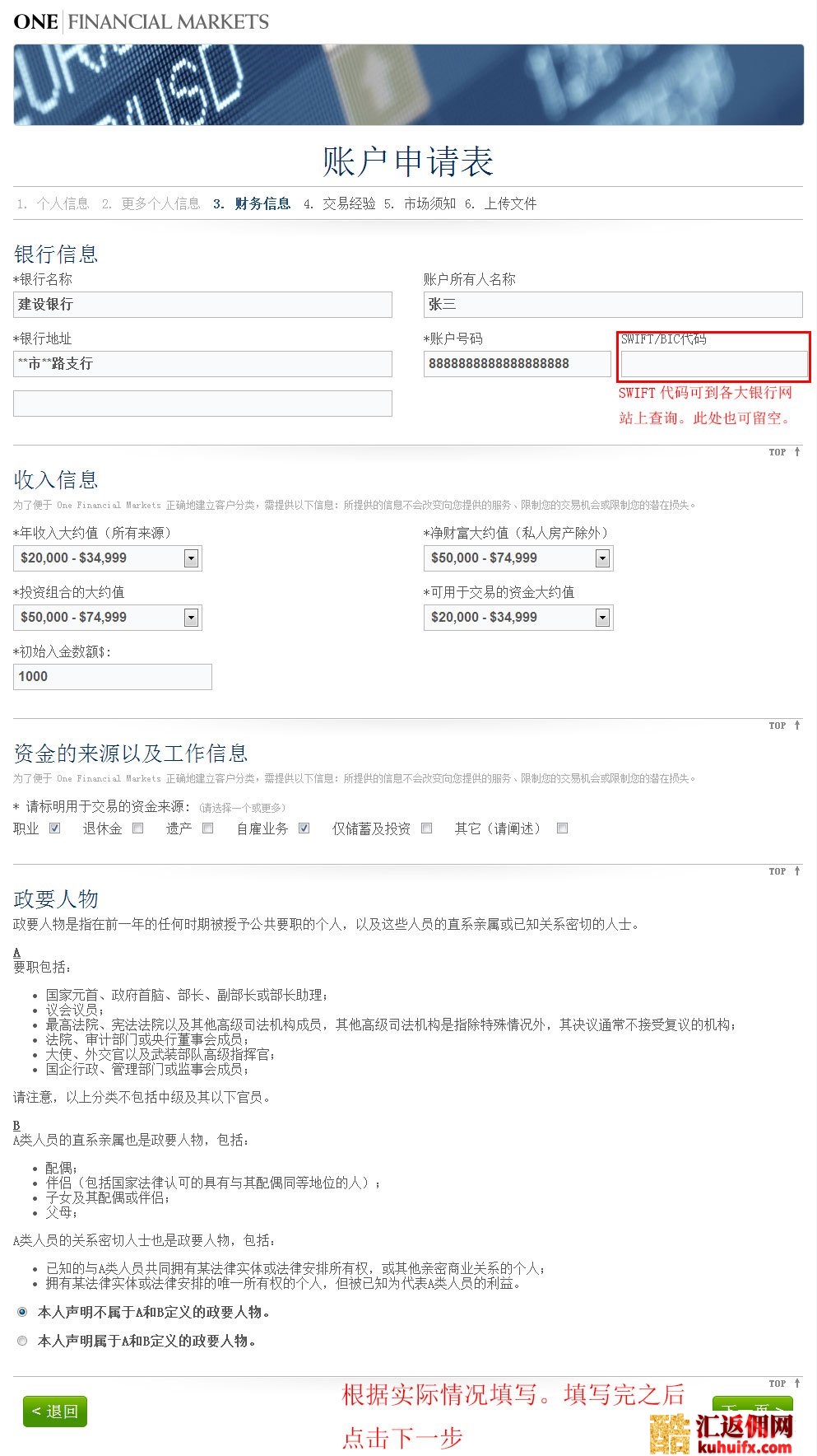按实际情况填写,填写完毕之后点击下一步。 四、填写财务信息: 请务必详细填写您的银行信息,此信息将用于您的出金操作。银行账号填写时请勿空格。 注意,这里的银行SWIFT代码可以去各大银行网站查询,如不知道可以留空。 另外,收入信息可以适当填高一点,这样有助于您的申请通过。 初始入金金额最低为260美金。
