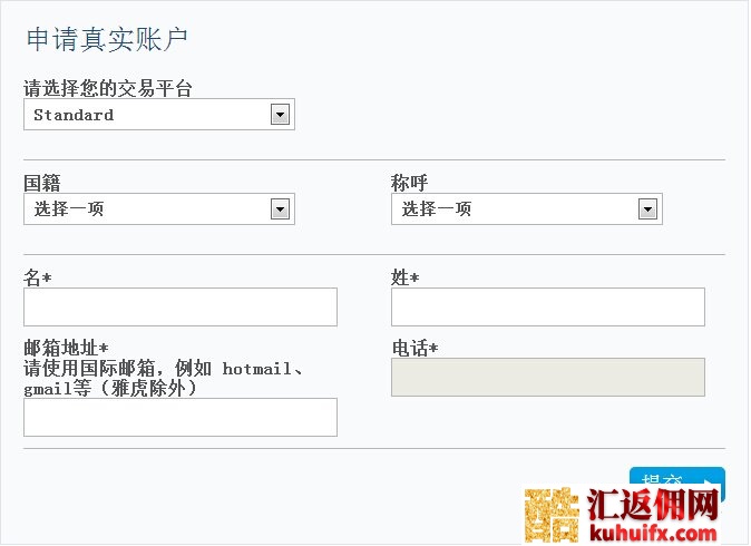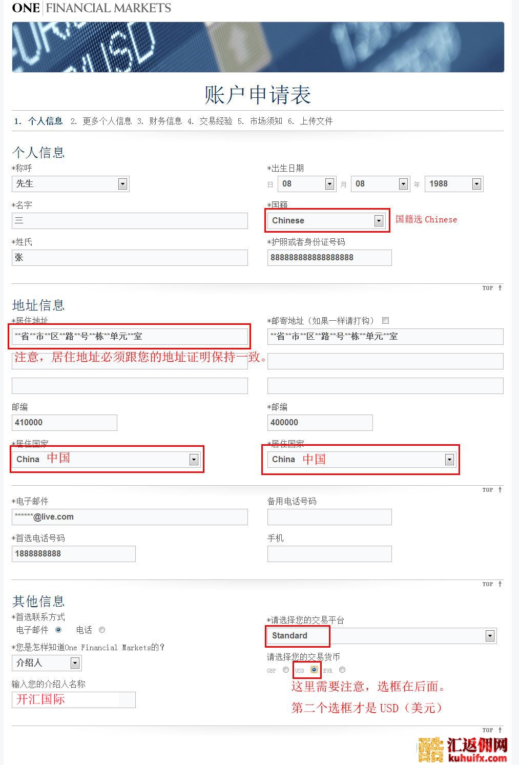 二、填写个人信息,需要注意如下几点: 1、国籍这里是英文的,选择Chinese(中国); 2、选择交易平台,选择Standard(MT4平台),交易货币选择USD(美元); 3、填写介绍人,介绍人名称请填写"酷汇返佣网"