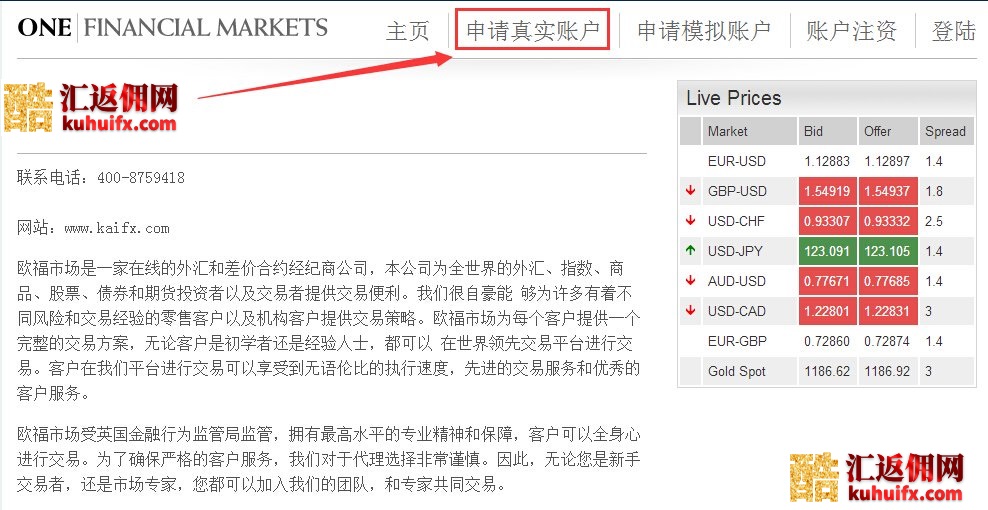 欧福平台开户流程:进入欧福市场官网,进行开户。 一、点击开户连接进入官网开户:点击进入 进入官网之后,可以看到【酷汇返佣网】字样,此为酷汇返佣网作为欧福市场顶级代理的证明。