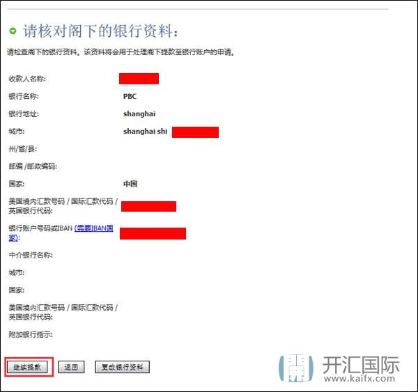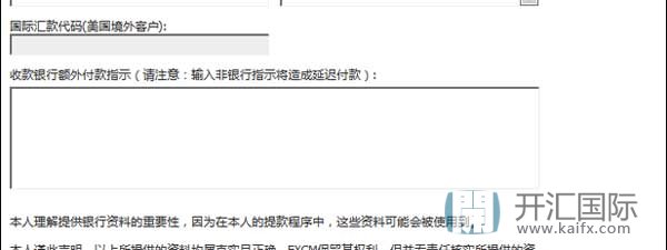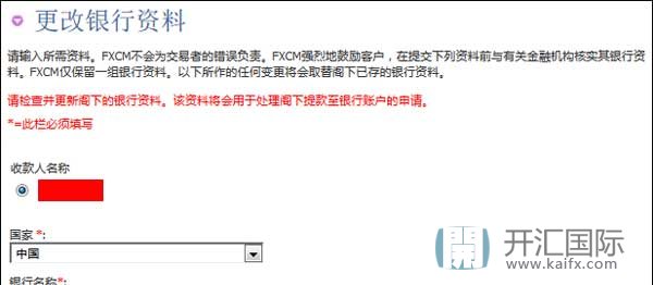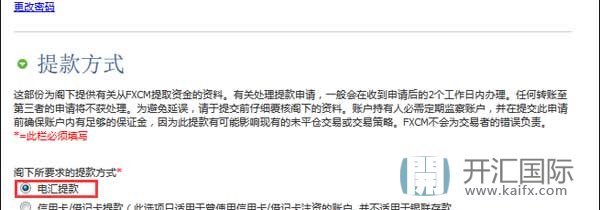 登录MyFxcm:点击登录>> 一、选择“提款”,“提款方式”选择电汇提款,点击继续。 二、如果您还添加银行信息之前,会出现“抱歉,我们没有收到所需银行资料的记录,请点击下面的更改银行资料按钮以更新阁下的信息”,按照提示操作 ,点击更改按钮。 三、进入“更改银行资料”界面(全部都必须填写拼音,没有带 “ * ” 号的可以不填写 )。 ● 国家:选择中国 ● 银行名称:要填写银行英文名字,比如:中国银行 填写“BankofChina”。(查看全部银行英文名称>>) ● 银行地址:填写开户行地址,拼音填写。 ● 国际汇款代码:填写swift code . ● 银行帐号号码或者IBAN:填写银行帐号。 五、选择“账户帐号”,填写提款金额,提款原因填写:旅游,赡养,购物之类的。或者可以不填写。 填写好之后点击“继续”。 |