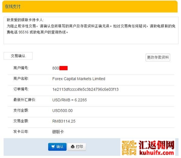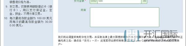 ------------------------------------------------------------------------ 银联入金 需知: ●第三者的付款将不被接受。 ●银联将以当天最新外汇牌价自动帮你转为人民币结算。 ●入金手续费: 豁免。 ●使用银联存款的交易账户,可能须使用原银行账户进行提款。 ●交易成功后,请按「返回商户」及保留交易确认画面以存作记录。 ●通过银联作出的存款一般会在收到款项后 1-2 个工作天内存入交易账户。 ●只接受美元的存款。 ●有关美金对人民币汇率会以当日中银香港价格为准。 ●本交易,仅限使用银联借记卡(银行卡),用以支付保证金,定金,按金。不得分单交易。 ●每次最低存款金额为 100.00 美元而每次的最高存款金额为 30,000.00 美元。 ------------------------------------------------------------------------ |