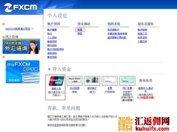 福汇平台Fxcm入金通道(点击查看其他入金通道): ● 电汇入金 >> ● 银联入金 >> ----------------------------------------------------------------------------------- 福汇Fxcm已经开通了银联入金通道(免手续费),首先登录MyFxcm>>(银联入金,必须要注意的条款,在本文最下,请一定要查看。) 一、登录到MyFxcm后,点击“资金调动”中的“存款”,进入如下页面。然后在“存入资金”栏目选择“银联入金”。